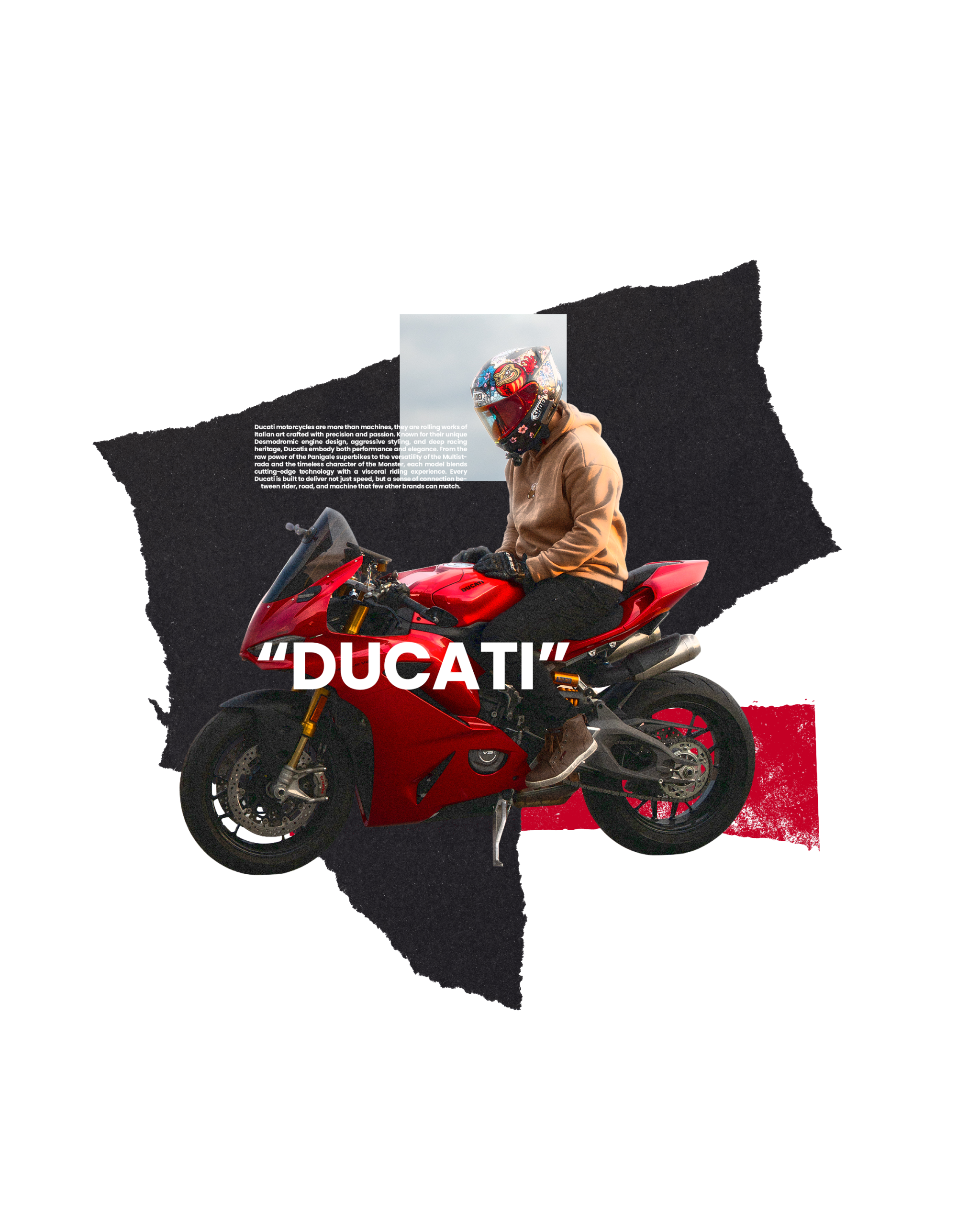 This visual series reimagines Ducati’s spirit of engineering and emotion through graphic storytelling. Each piece transforms the motorcycle from a machine into a metaphor for drive, identity, and transformation. The work captures the duality of precision and passion—how a Ducati feels as much as it performs.