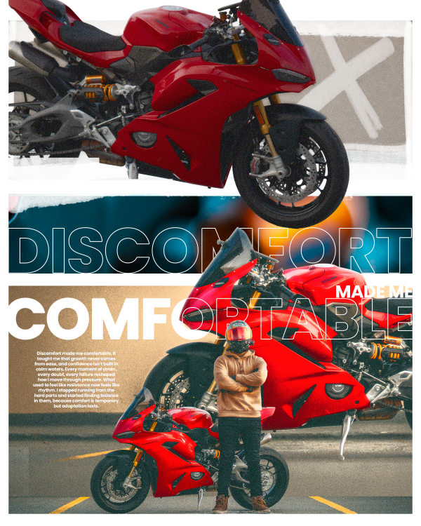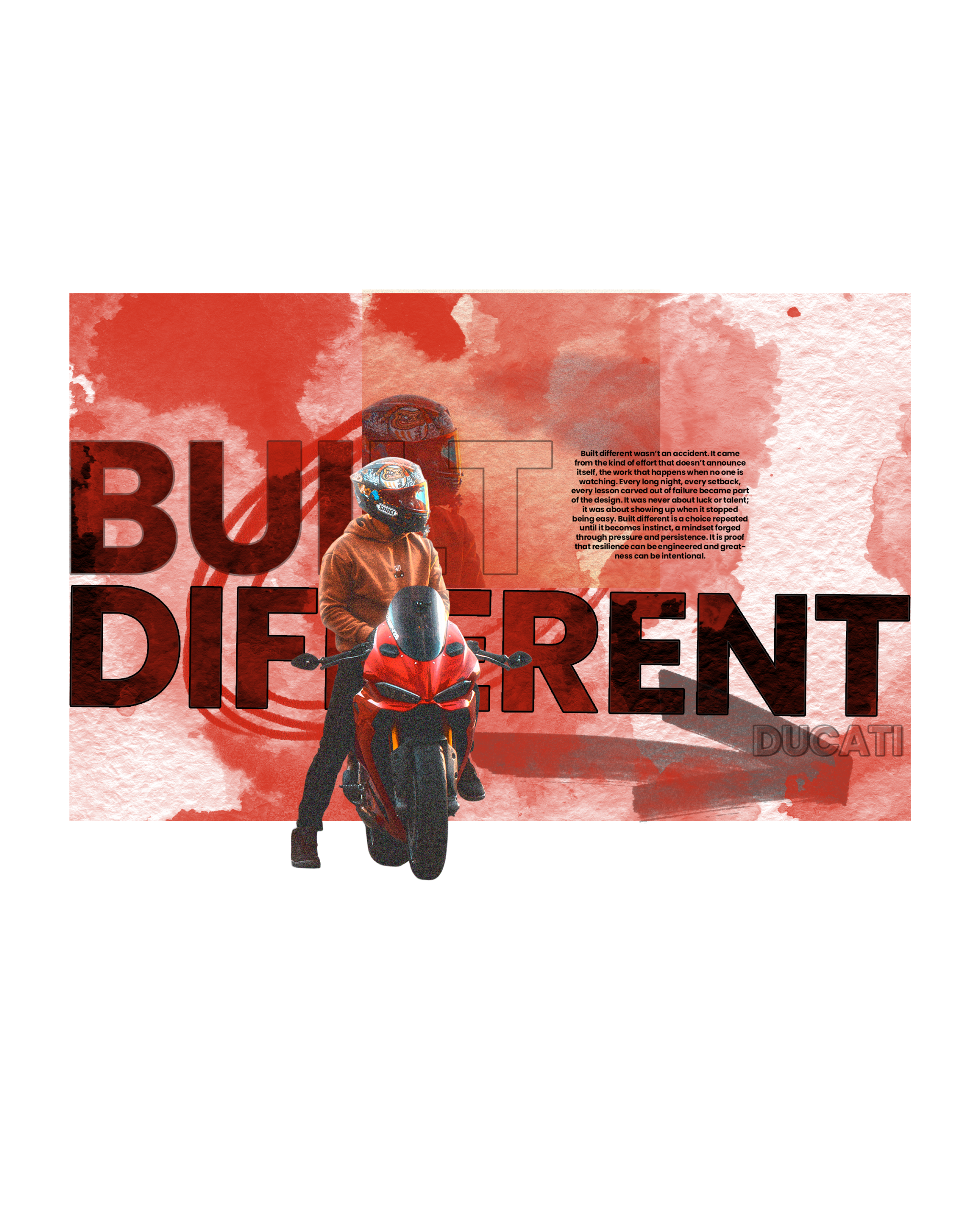 This project was created as a promotional exploration of Ducati’s visual language. It reframes performance as a personal narrative, celebrating not just the design of the bike, but the mindset it represents. Power through craft. Precision through emotion. Built to move, built to feel.